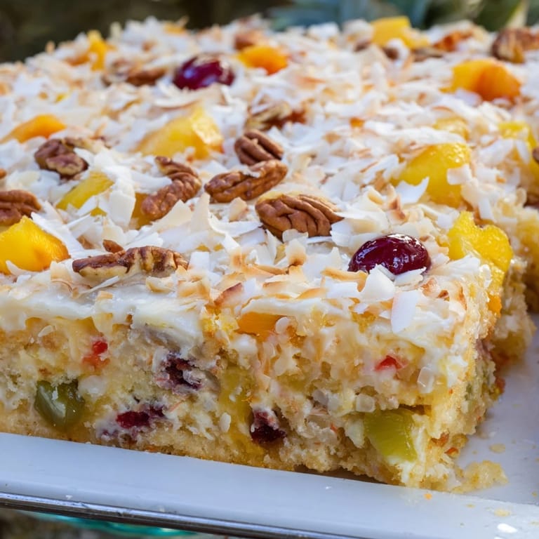 Save to Pinterest My neighbor brought this cake to a potluck on a sweltering July afternoon, and I watched people go back for thirds. When she finally shared the recipe, I was surprised by how simple it was—just a can of fruit cocktail doing all the heavy lifting while I stood there wondering why I hadn't thought of it sooner. The first time I made it, the kitchen filled with this warm, jammy sweetness that reminded me baking doesn't always require complexity. That coconut frosting poured hot over the warm cake created this tender, soaked-through texture that felt almost indulgent for something so effortless.