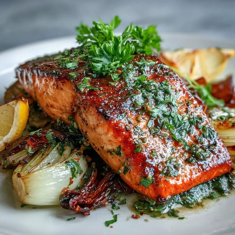Save to Pinterest The smell of roasted leeks hit me before I even opened the oven, sweet and soft, mingling with the richness of salmon skin crisping at the edges. I was testing this recipe on a cold Tuesday, craving something that felt nourishing without demanding much from me. The parsley dressing came together while I waited, bright green and sharp, and when I spooned it over the golden fillets, I knew I'd be making this again and again. It's the kind of meal that feels elegant but forgives distraction, which is exactly what I needed that night.